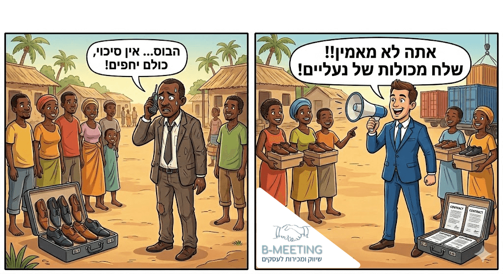 אחד ראה שכולם יחפים ודיווח: "אין פה שוק, חבל על הזמן… אי אפשר למכור נעליים למי שלא נועל אותן"